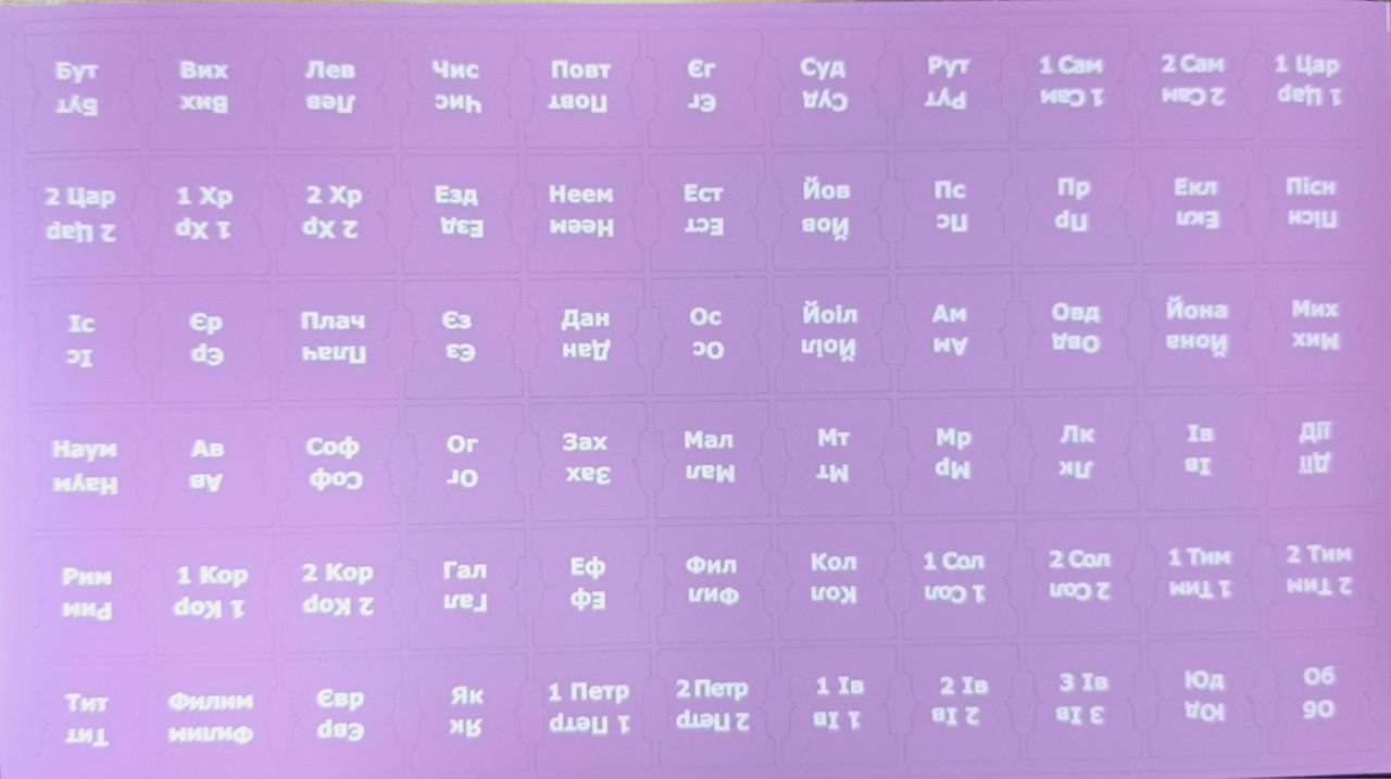 Індекси пошукові українською мовою. Прорізані (не потрібно вирізати кожну назву книги). Розраховано на книги Старого та Нового Заповіту, тільки на канонічні книги. Виконано в ніжному бузковому кольорі. Текст нанесений білим кольором.