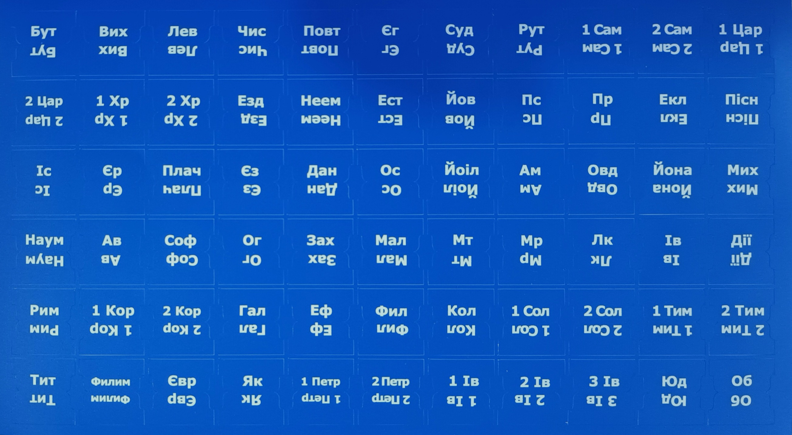 Індекси пошукові українською мовою. Прорізані (не потрібно вирізати кожну назву книги). Розраховано на книги Старого та Нового Заповіту, тільки на канонічні книги. Виконано в синьому кольорі. Текст нанесений чорним кольором.