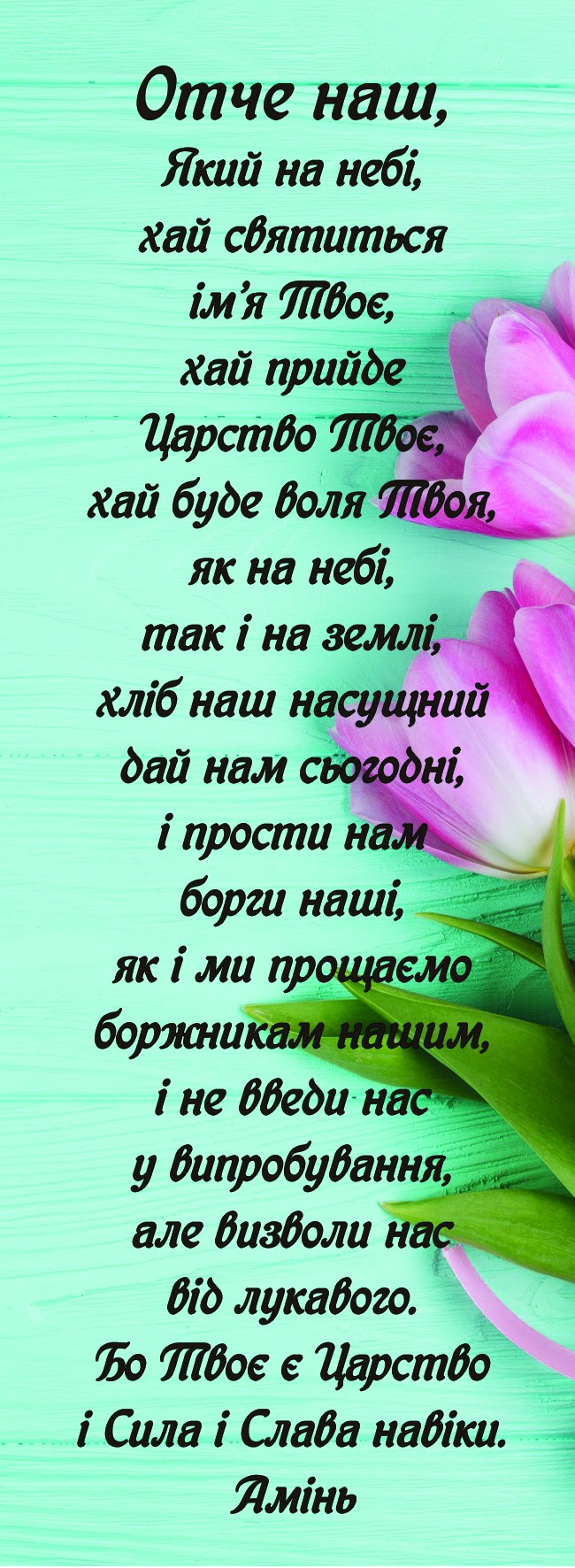 Закладка картонна. Зворотня сторона без тексту, можна використовувати для нотаток. Загальний розмір 150х54 мм. Текст українською мовою. Біблійні вірші взяті з Біблії