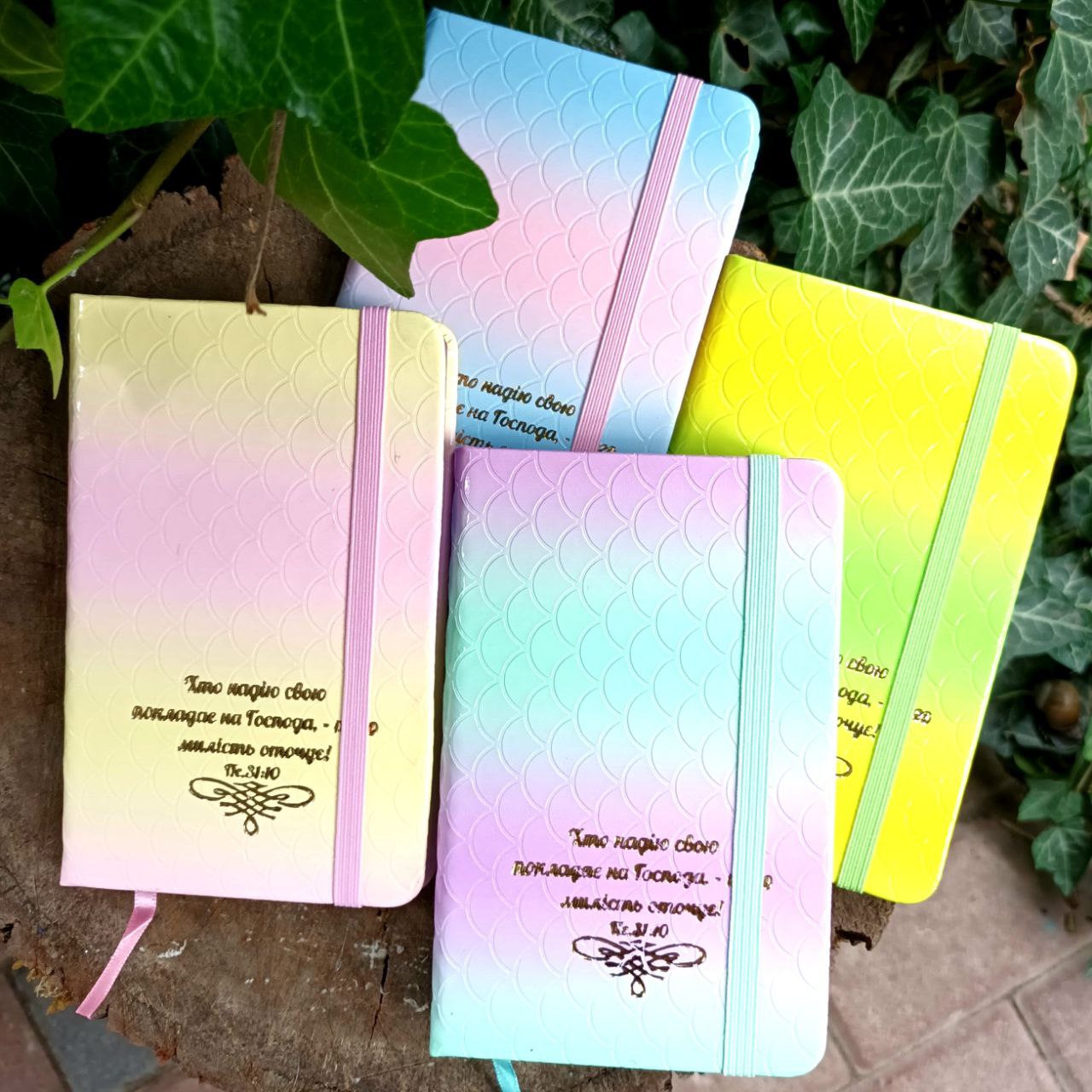 Обкладинка тверда, фіксується резинкою. Колір різний, асорті.