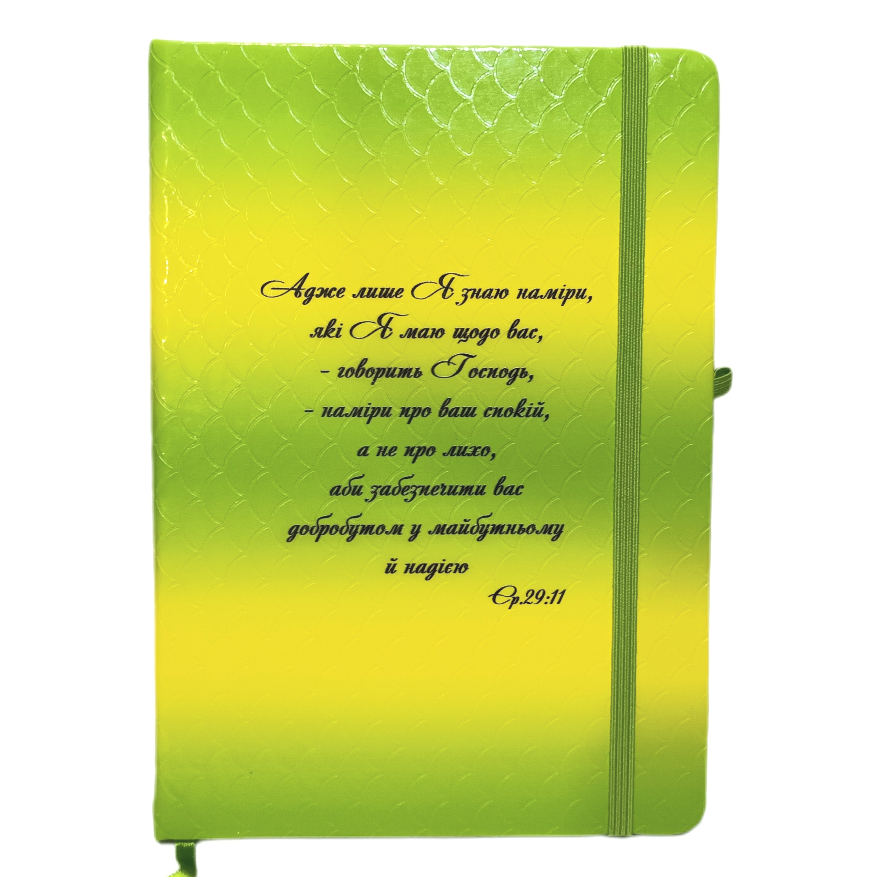 Записник з біблійним текстом "Алже лише Я знаю наміри, які маю про вас - говорить Господь, наміри про ваш спокій, а не про лихо, аби забезпечити вас добробутом у майбутньому і надією" Обкладинка тверда, глянцева. Колір комбінований. Паперовий блок в клітинку. Має стрічку-закладку. Боковий зріз профарбований. Збоку резинка для фіксації кулькової ручки.