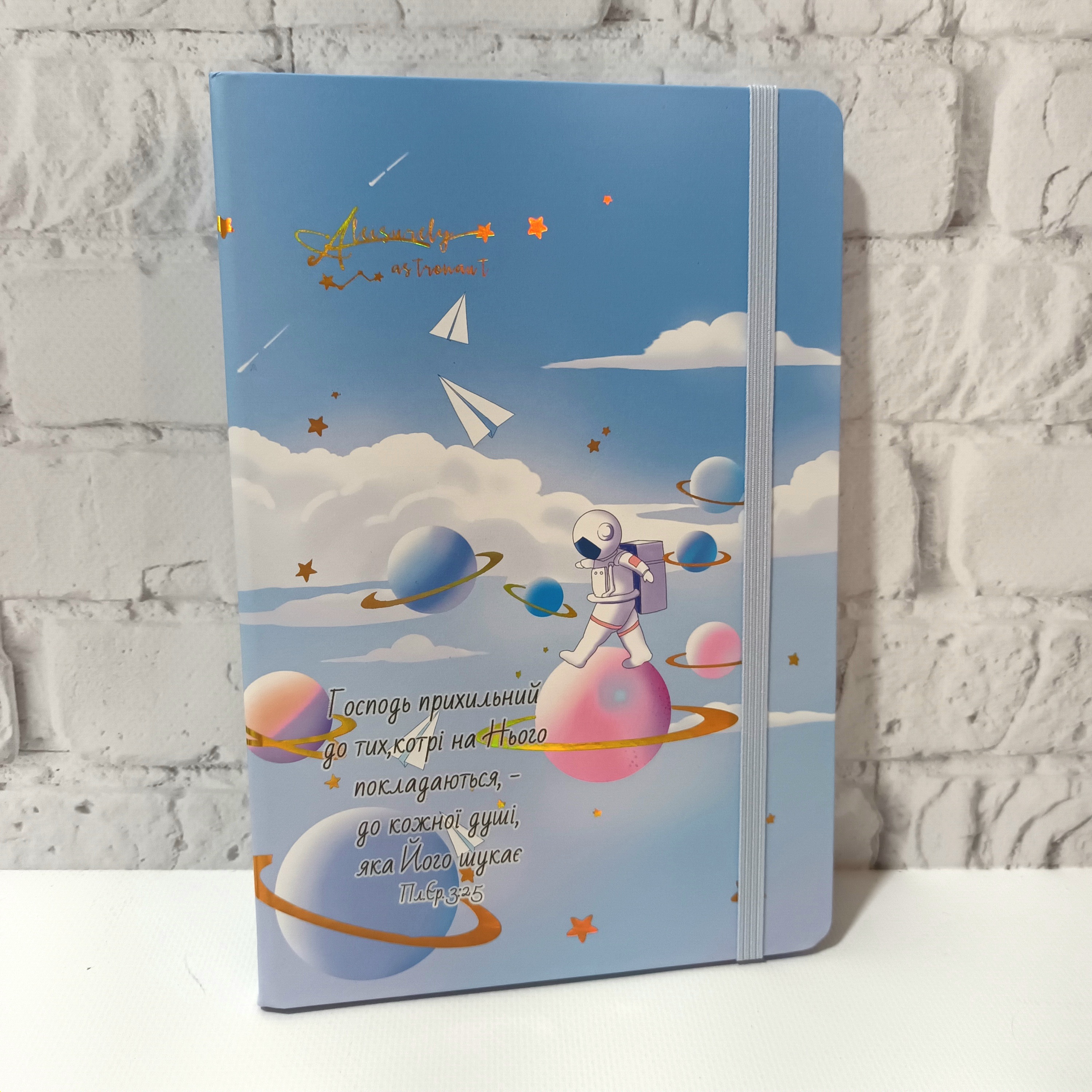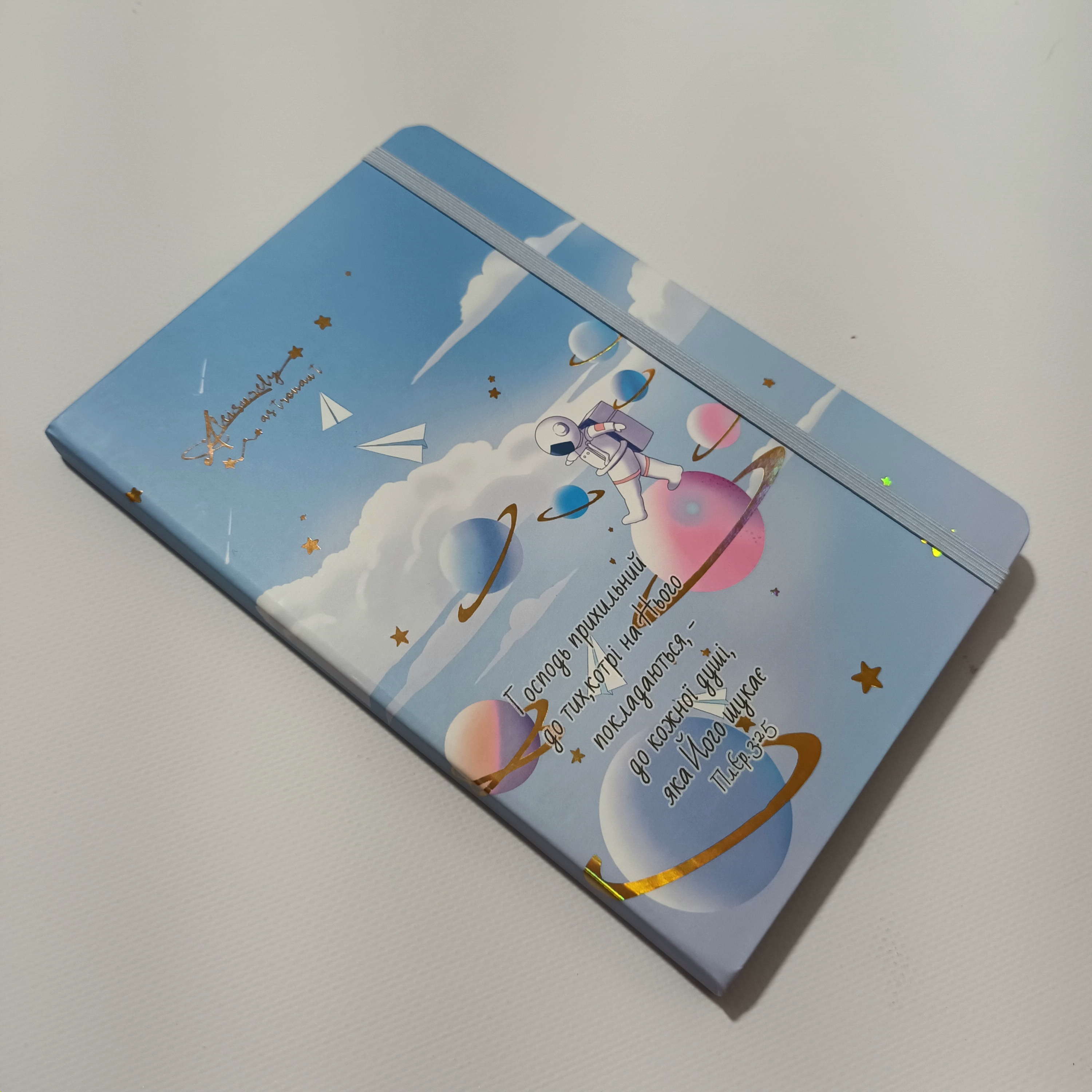 Записник формату А5 (розмір 145х210мм). Обкладинка тверда з кольоровим принтом. Біблійний текст на обкладинці українською мовою: Плач Єремії 3:25. Паперовий блок в клітинку. Має стрічку-закладку. Обкладинка фіксується резинкою по всій висоті. Боковий зріз прокрашений. Збоку резинка-тримач для кулькової ручки.
