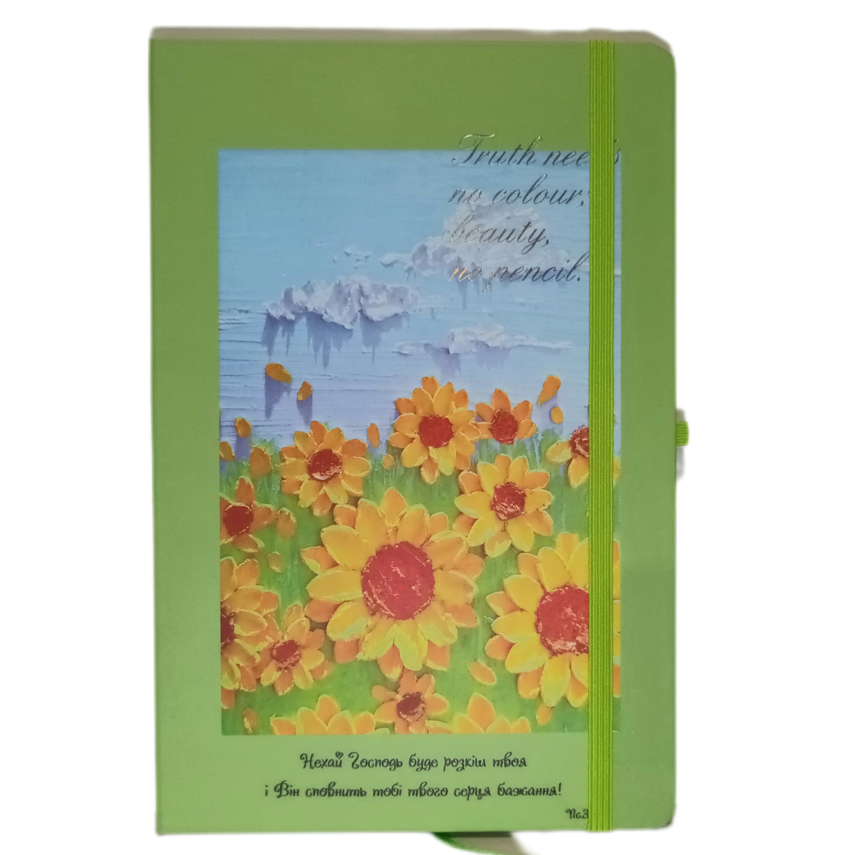 Записник з біблійним текстом "Нехай Господь буде розкіш твоя і Він сповнить тобі твого серця бажання!". Формат А5. Обкладинка тверда. Колір зелений з малюнком. Паперовий блок в лінійку. Боковий зріз профарбований. Має стрічку-закладку. Збоку резинка для фіксації кулькової ручки.