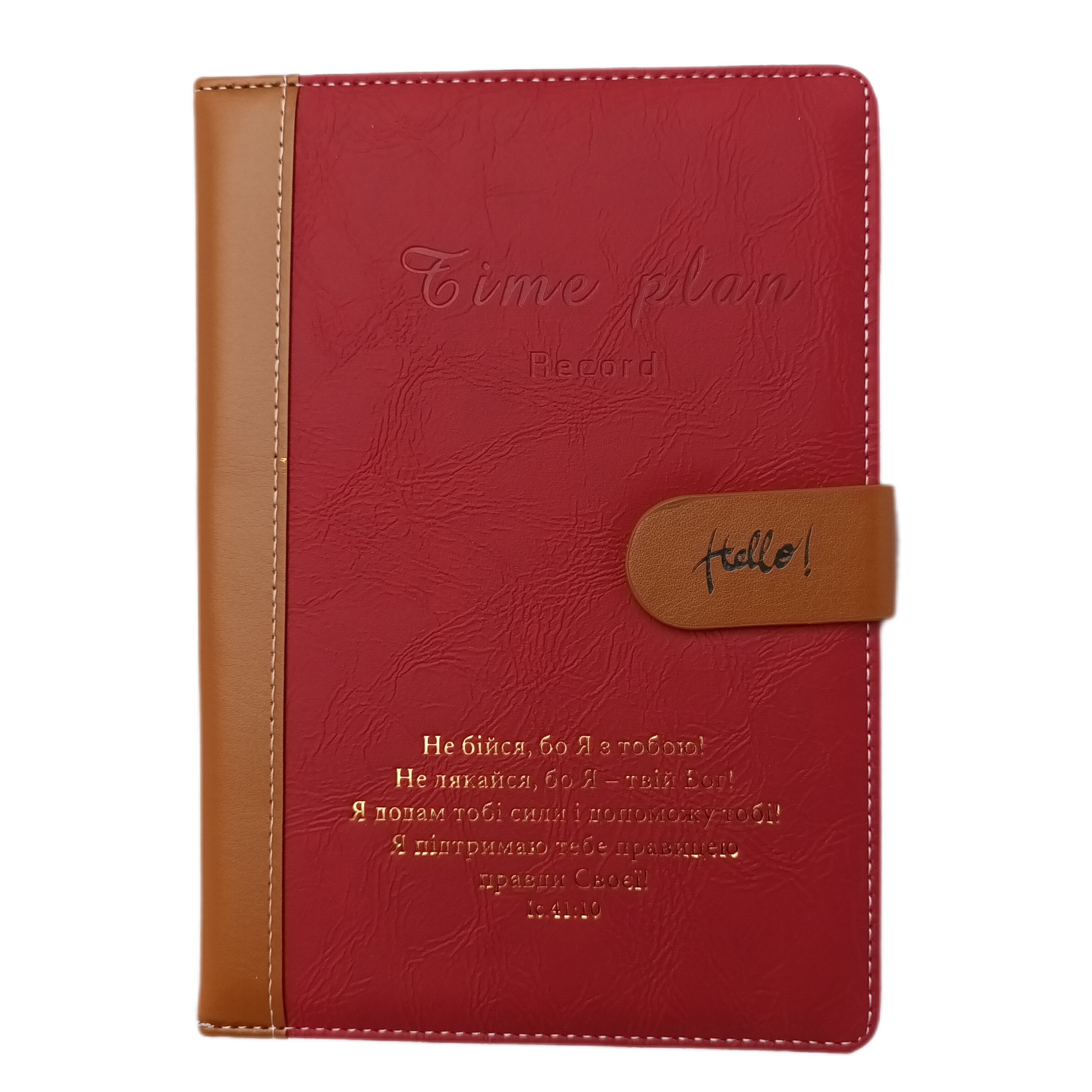 Класичний записник в червоному кольорі. На обкладинці біблійний текст Ісаї 41:10. Паперовий блок в клітинку. Обкладинка фіксується застібкою на магніті. Формат А5.