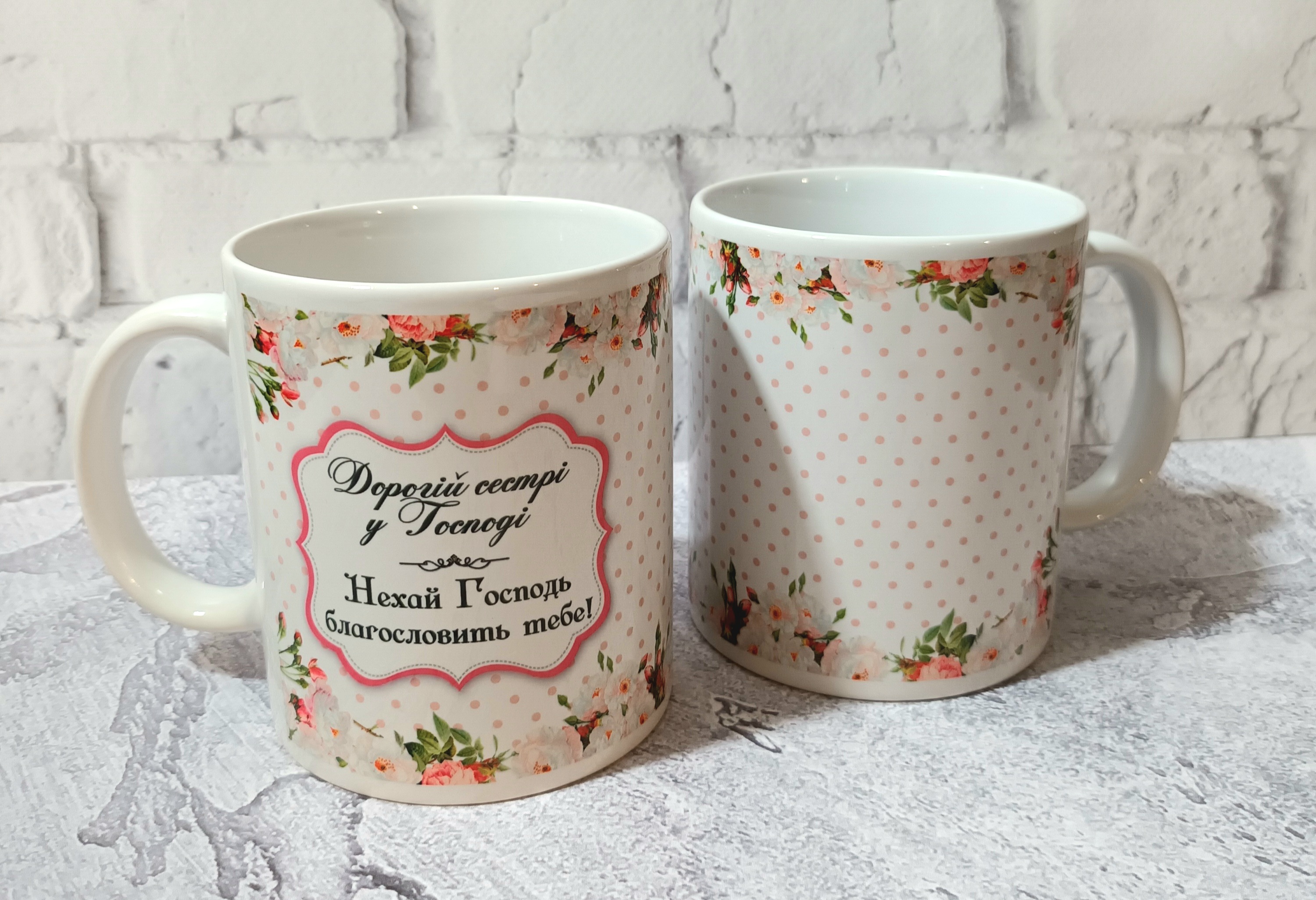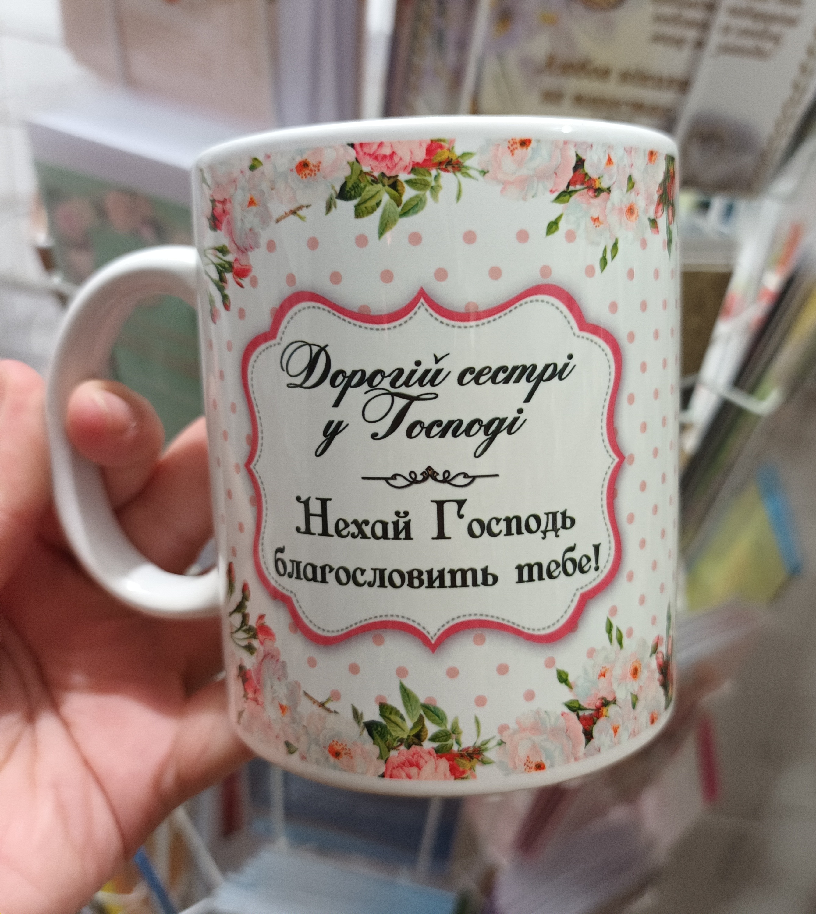 ЧАШКА БІЛОГО КОЛЬОРУ З КОЛЬОРОВИМ МАЛЮНКОМ. Об’єм 330 мл. Напис українською мовою. Текст: Дорогій сестрі у Господі. Нехай Господь благословить тебе.