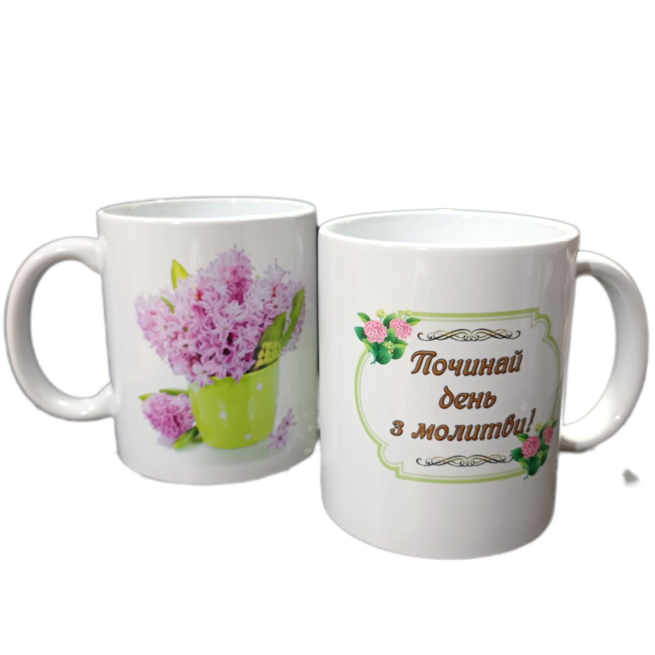 Чашка біла з принтом. Загальний об’єм 330мг. Чашка циліндричної форми.