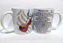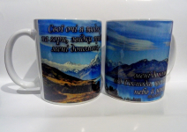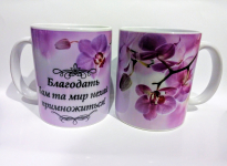 Біла керамічна чашка об'ємом 330мл. Має циліндричну форму. Зручна для використання ручка-вушко. Колір чашки білий, поверхня гладенька, глянцева. Малюнок кольоровий. Текст українською мовою: "Благодать вам і мир нехай примножаться". ...
