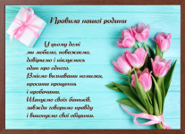 Картина формату А4 (32х22 см). Яскравий малюнок з біблійним текстом.  У ЦЬОМУ ДОМІ МИ ЛЮБИМО, ПОВАЖАЄМО, ДОВІРЯЄМО І ПІКЛУЄМОСЯ ОДИН ПРО ОДНОГО. ВМІЄМО ВИЗНАВАТИ ПОМИЛКИ, ПРОСИТИ ПРОЩЕННЯ І ПРОБАЧАТИ. ШАНУЄМО СВОЇХ БАТЬКІВ, ЗАВЖДИ ГОВ...