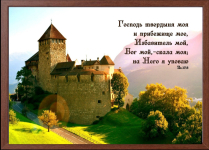 Картина формату А4 (32х22 см). Яскравий малюнок з біблійним текстом. ГОСПОДЬ ТВЕРДЫНЯ МОЯ И ПРИБЕЖИЩЕ МОЕ, ИЗБАВИТЕЛЬ МОЙ, БОГ МОЙ, - СКАЛА МОЯ; НА НЕГО Я УПОВАЮ. Рамка може відрізнятися в залежності від партії....