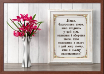 Картина формату А4 (32х22 см). Яскравий малюнок з біблійним текстом. БОЖЕ, БЛАГОСЛОВИ ТОГО, ХТО ВХОДИТЬ У ЦЕЙ ДІМ, ЗАХИСТИ І ЗБЕРЕЖИ ТОГО, ХТО ВИХОДИТЬ З НЬОГО І ДАЙ МИР ТОМУ, ХТО В НЬОМУ ЗАЛИШАЄТЬСЯ!. Рамка може відрізнятися в залежност...