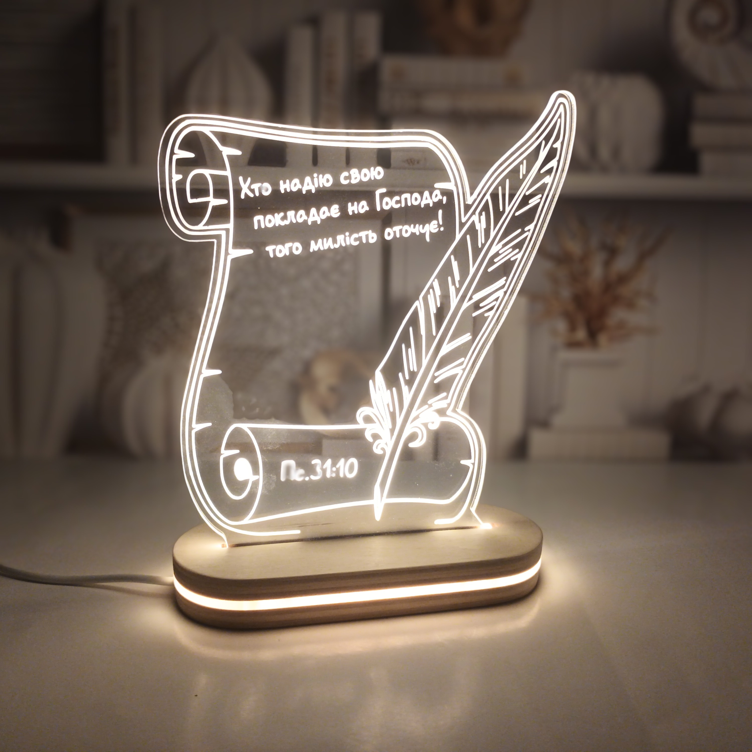 "Хто надію свою покладає на Господа, того милість оточує!" - напис на світильнику з підствіткою українською мовою. Розмір загальний 14х17см. Живлення від електромережі, USB-адаптер входить в комлект. Все компактно складається в коробочку, дуже легенький.